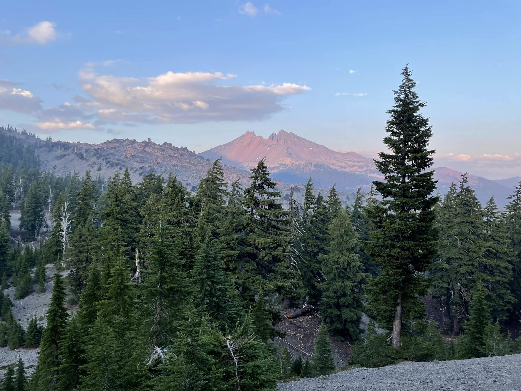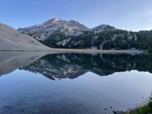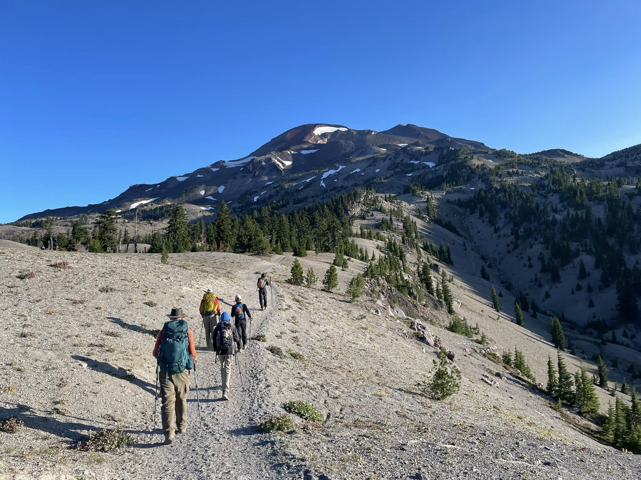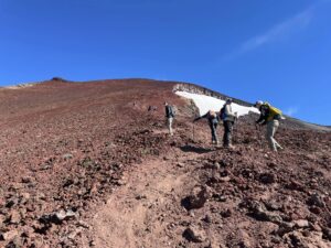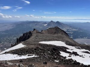 This is a strenuous hike, but not prohibitively difficult. The first day from trailhead to camp gains over 1000 feet in just a mile. From camp to the summit the next day is nearly 4000 feet, so pace yourself. The most difficult section is the final Red Mile: a steep slope of red gravel. After cresting the ridge, it's an easy quarter mile around the caldera to the true summit. Each lunch and enjoy the views. If there are no clouds (or wildfire smoke) you can see the entire chain of cascade volcanoes all the way to Mount Rainer to the north, and Mount Shasta to the south.
